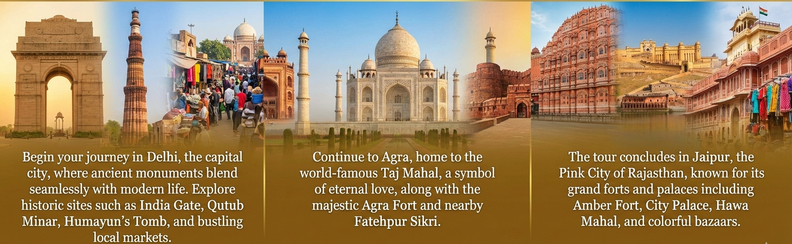 Begin your journey in Delhi, the capital city, where ancient monuments blend seamlessly with modern life. Explore historic sites such as India Gate, Qutub Minar, Humayun’s Tomb, and bustling local markets. Continue to Agra, home to the world-famous Taj Mahal, a symbol of eternal love, along with the majestic Agra Fort and nearby Fatehpur Sikri. The tour concludes in Jaipur, the Pink City of Rajasthan, known for its grand forts and palaces including Amber Fort, City Palace, Hawa Mahal, and colorful bazaars.